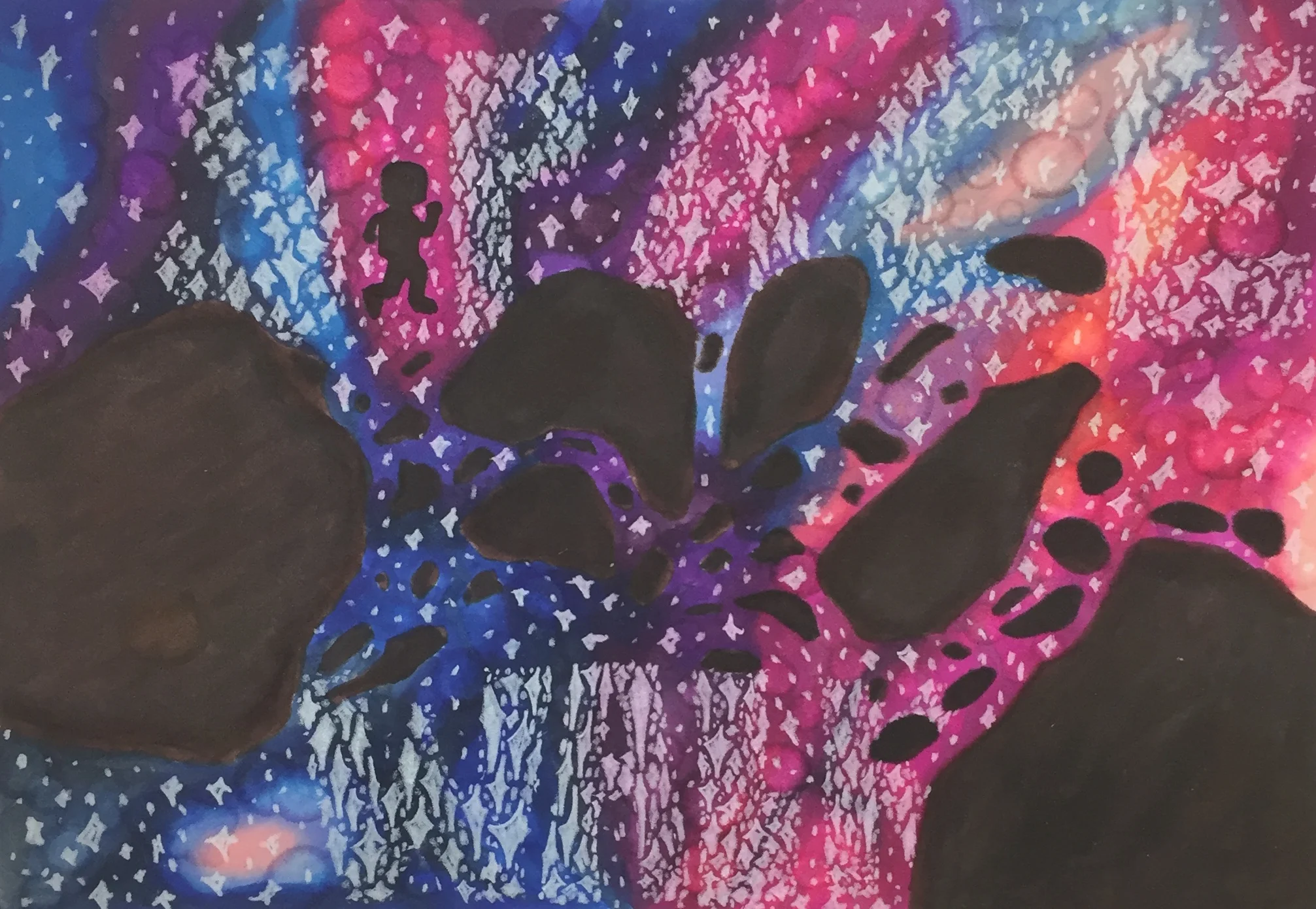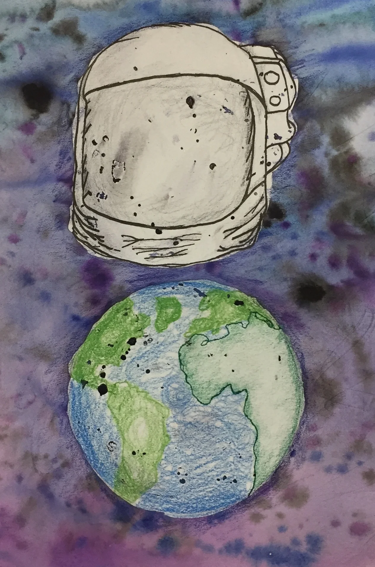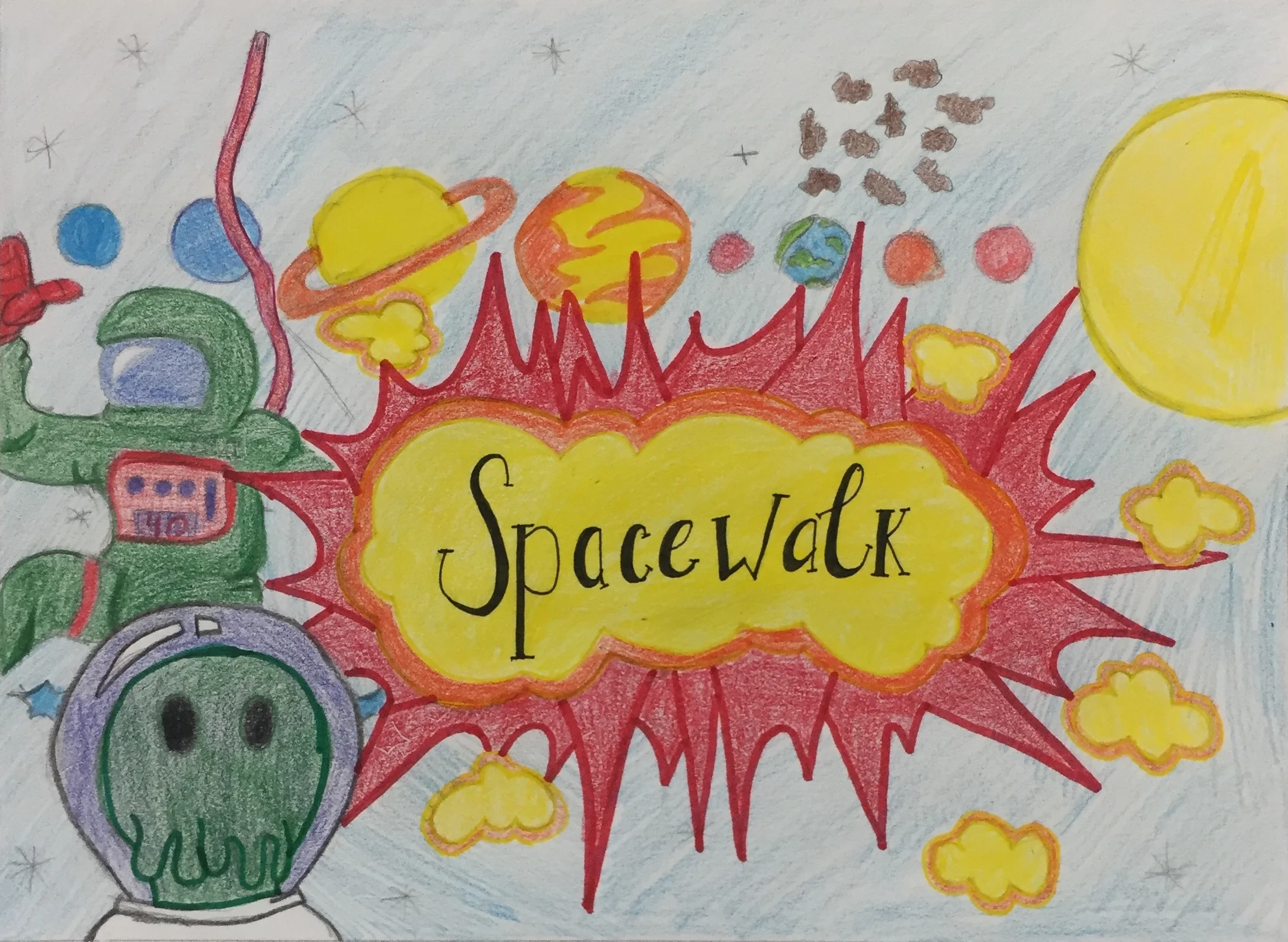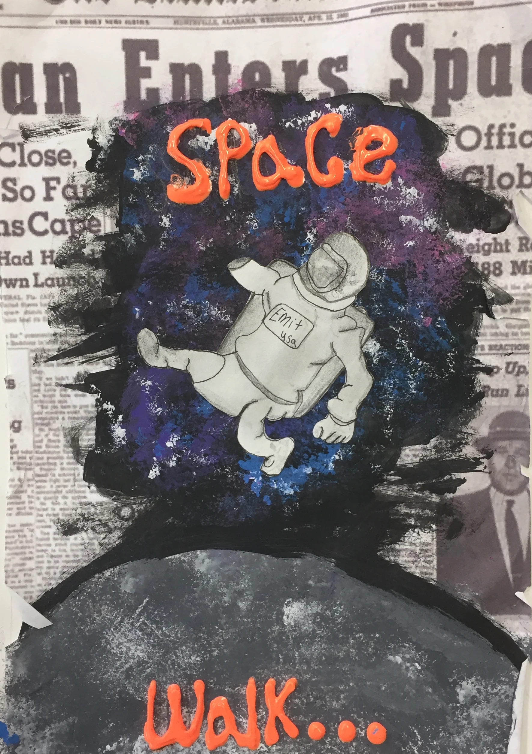 Below you will find art that was inspired by the music and story line of Space Walk. Charlie Lotspeich collaborated with the Art department (Shannon Weaver and Kari Dollar) at his former school (Coppell Middle School North) to have the students create pieces centered around the project. This art was featured at the event as a gallery. Students listened to the music and read the story line, here is what they came up with!